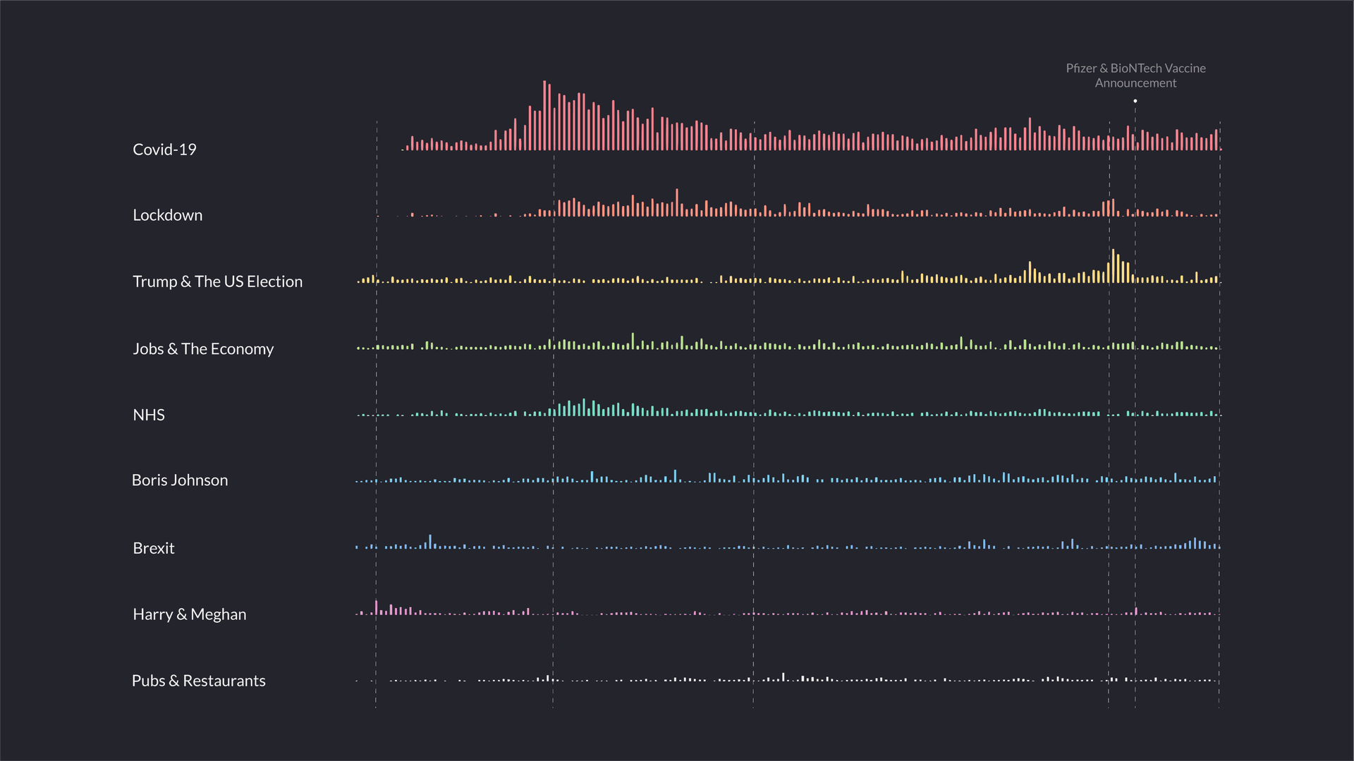April 13, 2020The Top Stories in 2020 according to every tweet from 38 UK news publishersAndy ClarkeWe collected every tweet in 2020 from 38 UK news organisations to find out what the media have been reporting on. Then we visualised categories of tweets as trends to see what the British media landscape looked like throughout the year.